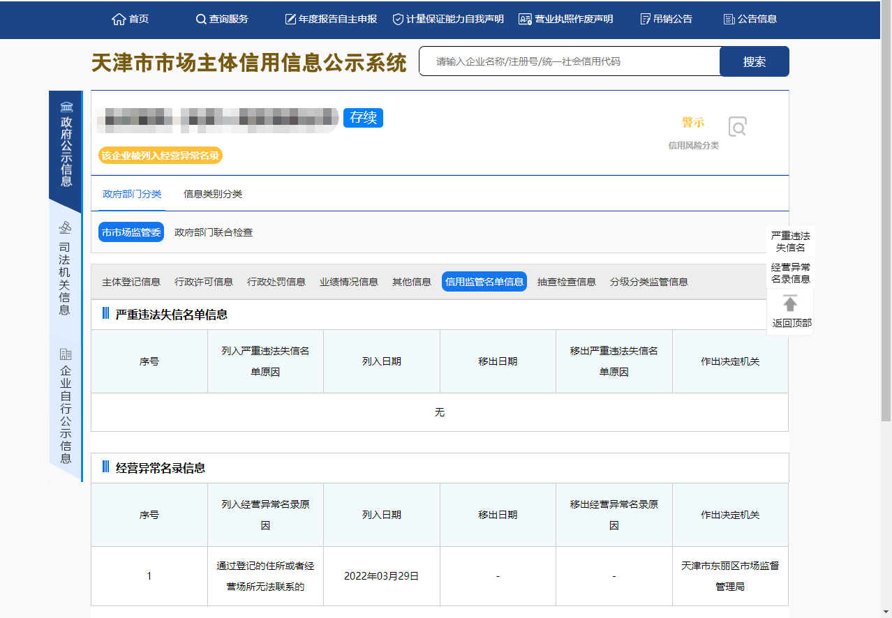 同时,依据《天津市市场主体信用风险分类办法》第十条的规定,本市市场主体被列入经营异常名录(标记为经营异常状态)的,在“天津市市场主体信用信息AG真人系统”上的信用风险类别为“警示”,会在市场主体信用信息页面的右上角显著提示。
